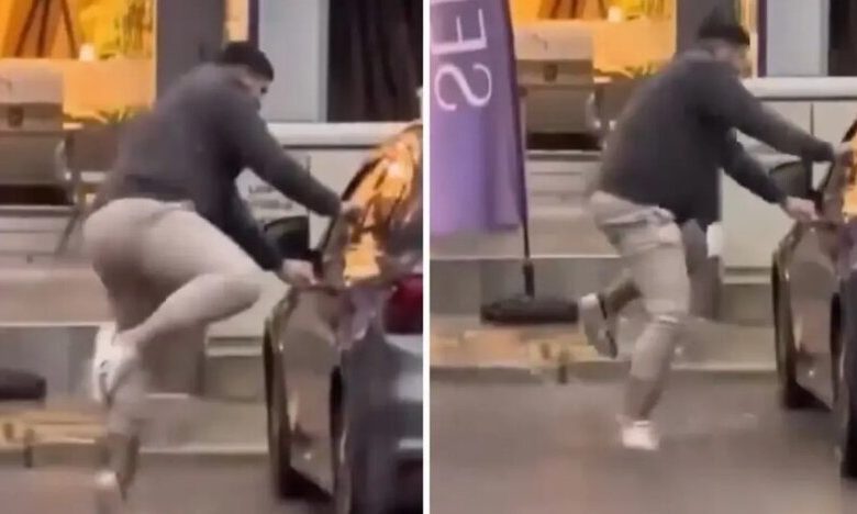 Yağışdan islanmamaq üçün avtomobilinə doğru irəliləyən şəxs suya girməmək məqsədilə tək ayaq üzərində hərəkət etməyə çalışıb. Onun bu qeyri-adi və akrobatik hərəkətləri ətrafda olan bir nəfər tərəfindən mobil telefon kamerası ilə lentə alınıb.